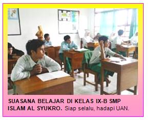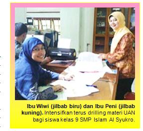 Menurut Ibu Wiwi, nilai standar ’Lulus’ yang ditetapkan oleh PRIMAGAMA sangat tinggi. Artinya, bila dibandingkan dengan nilai standar ’Lulus’ di SMP Islam Al Syukro, maka nilainya memang kelewat tinggi. â€Nilai standar kelulusan yang ditetapkan oleh PRIMAGAMA memang sangat tinggi. Sehingga, siswa-siswa kita yang sebenarnya sudah ’Lulus’ untuk ruang lingkup nilai standar internal Al Syukro, terpaksa kurang mencukupi nilainya bila dihitung dengan nilai standar yag diberlakukan oleh PRIMAGAMA itu,†jelas Ibu Wiwi dengan wajah optimis. (fdl)