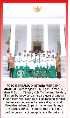 Setelah para siswa SMP Islam Al Syukro menuntaskan Kunjungan Tema ke Kantor Kedutaan Besar Turki (bagi siswa kelas VII dan VIII) dan Museum Gajah (untuk siswa kelas IX), kedua rombongan ‘terpisah’ ini akhirnya berkumpul kembali untuk melanjutkan anjangsana ke lokasi berikutnya, yaitu ke ISTANA MERDEKA di Jalan Medan Merdeka Utara, Jakarta Pusat. Inilah rangkaian field trip yang mengambil tema “Nasionalisme dan Membangkitkan Semangat Kebangsaan” dan diselenggarakan pada Sabtu, 13 Februari 2010.