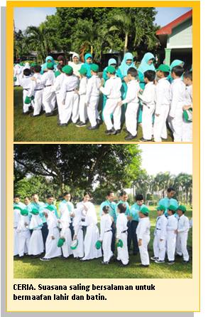 Usai upacara, seluruh siswa saling berbaris rapi memanjang dan memenuhi lapangan rumput sekolah untuk satu per satu menyalami dan saling memohon maaf lahir dan batin kepada para pimpinan sekolah, para guru dan antar mereka masing-masing.