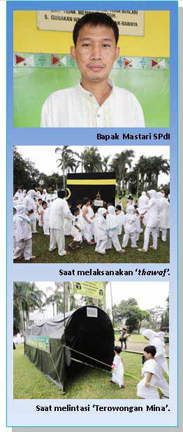 Khusus untuk siswa kelas I SD Islam Al Syukro, lanjut Pak Mastari, pelaksanaan manasik haji ini adalah untuk mengenalkan praktik-praktik ibadah haji, mulai dari berniat haji, berpakaian ihram, melakukan thawaf dengan mengelilingi miniatur Ka’bah, memasuki miniatur Terowongan Mina, melontar tiga jumroh Ula’, Wustha dan Aqobah, berjalan dan berlari-lari kecil untuk Sa’i, ber-Tahalul, dan meminum air ‘zam-zam’. “Termasuk kerapihan dan ketertibannya,” ujarnya.