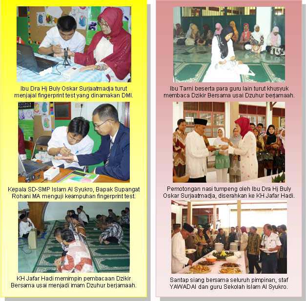 ”Kami selalu berusaha meningkatkan mutu pendidikan di Al Syukro ini dan tentunya kita sepakat bahwa pendidikan yang bermutu akan membawa kita pada terbentuknya generasi lebih baik. Untuk tujuan itu, kita berusaha di lembaga masing-masing, dengan tugas dan tanggung jawab semuanya kita dedikasikan untuk melahirkan generasi yang lebih baik dimasa yang akan datang,” tutur Ketua Umum YAWADAI, Ibu Dra Hj Buly Oskar Surjaatmadja dalam kata sambutannya memperingati milad ke-14 YAWADAI, pada Sabtu-17 April 2010 di Sekolah Islam Al Syukro.