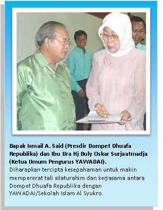 “Kami berterima kasih dengan kehadiran Presiden Direktur DDR yang telah bersilaturahim dan meninjau langsung Sekolah Islam Al Syukro di Ciputat, Tangerang Selatan ini. Dari apa yang telah kami simak, banyak sekali kemungkinan-kemungkinan kerjasama yang dapat dilaksanakan, antara DDR dengan YAWADAI dan Sekolah Islam Al Syukro. Apalagi, DDR juga telah mengelola bidang pendidikan untuk kaum dhuafa. Bisa jadi, bila sekolah yang telah dikelola oleh DDR itu kurang dapat menampung jumlah murid, maka layak pula bila dipikirkan kerjasama agar para siswa tadi dapat disalurkan ke Sekolah Islam Al Syukro ini, misalnya. Tentu saja, karena hal demikian menyangkut program pendidikan untuk kaum dhuafa, maka kami tidak akan terlalu banyak membebani, semisal memungut uang sekolah dan lainnya. Nah, imbal baliknya, Sekolah Islam Al Syukro dapat dibantu oleh DDR dalam bentuk kerjasama yang lain. Atau, mungkin direalisasikan pengembangan jenjang pendidikan lebih lanjut dari Sekolah Islam Al Syukro ini, hingga ke jenjang pendidikan untuk Perguruan Tinggi,” tutur Ibu Oskar.