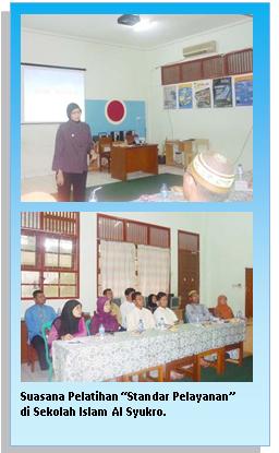 Bertempat di ruang multimedia Sekolah Islam Al Syukro, sejumlah guru dan staf sekolah, pada Jum’at pagi, 3 Desember 2010 kemarin, nampak serius menyimak paparan materi pelatihan mengenai ‘STANDAR PELAYANAN’. Materi pelatihan ini disampaikan oleh pembicara yang sangat berkompeten dibidangnya yaitu Ibu Risti Reita, selaku mantan Senior Customer Service pada sebuah bank swasta nasional.