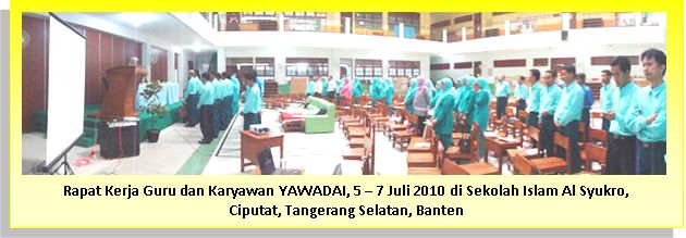 Demikian disampaikan Bapak Ii Sumirat SPdI---saat memberikan sambutan ‘selamat datang’---selaku Ketua Panitia Pelaksana Raker Guru dan Karyawan Yayasan Wakaf Daar Asykaril ‘Ibaad (YAWADAI) yang diselenggarakan pada Senin-Rabu (5-7 Juli 2010) di hall Gedung SD-SMP Islam Al Syukro, Ciputat, Tangerang Selatan, Banten.