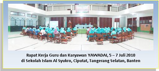 Diantara agenda kegiatan dalam Rapat Kerja (Raker) Guru dan Karyawan Yayasan Wakaf Daar Asykaril ‘Ibaad (YAWADAI) yang diselenggarakan pada Senin-Rabu (5-7 Juli 2010) di hall Gedung SD-SMP Islam Al Syukro, Ciputat, Tangerang Selatan, Banten, adalah mengumumkan sejumlah keputusan YAWADAI. Dan seperti biasanya, Bapak Ahmad Syathori SHI selaku Kepala Unit Umum merangkap Kepala Unit Sumber Daya Manusia (SDM) YAWADAI menaiki panggung dan berdiri di podium kehormatan untuk membacakan sejumlah keputusan tersebut.