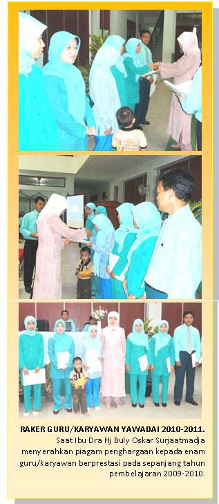 Salah satu mata acara yang ditunggu-tunggu pada setiap pelaksanaan Rapat Kerja (Raker) adalah pengumuman guru dan karyawan berprestasi. Tak beda dengan suasana pada Raker Guru dan Karyawan Yayasan Wakaf Daar Asykaril ‘Ibaad (YAWADAI) Tahun Pembelajaran 2010-2011 yang diselenggarakan pada Senin-Rabu (5 - 7 Juli 2010) di hall Gedung SD-SMP Islam Al Syukro, Ciputat, Tangerang Selatan, Banten.