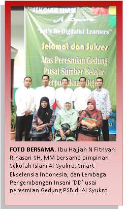 “Karena itu, tak salah bila kita mengusung tema acara peresmian pengoperasian Gedung PSB ini dengan semboyan: Let’s Be Digitalist Learner’s. Hingga kini, sudah tersedia sekitar 100 buah keping cakram digital berupa VCD, CD dan DVD yang berisi tentang materi pembelajaran yang terkait dengan pembelajaran inti dan pendukung. Insya Allah, akan segera dilakukan penambahan berupa 100 keping cakram digital lagi untuk semakin memperkaya khasanah Perpustakaan Digital di Gedung PSB ini. Sekali pun demikian, perpustakaan (konvensioal) berupa buku-buku dan aneka bacaan masih tetap ada, serta semakin ditingkatkan pula kuantitas maupun kualitas buku-bukunya, yang semuanya berada di lantai II Gedung PDST Sekolah Islam Al Syukro,” ujar Pak Supangat bangga. (fdl)