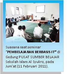 Masih dalam rangkaian kegiatan peresmian pengoperasian Gedung Pusat Sumber Belajar (PSB), di penghujung acara diselenggarakan pula Seminar bertemakan ‘Pembelajaran Berbasis Information and Technology (IT)’, dengan menampilkan pembicara yakni Ketua Lembaga Pengembangan Insani (LPI) Dompet Dhuafa Republika, Ibu Sri Nurhidayah.