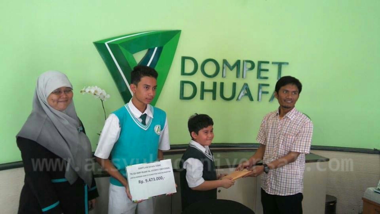 Bertempat di Kantor Dompet Dhuafa Filantrophy Ciputat, Perguruan Islam Al Syukro Universal Ciputat, hari Senin (2/11/2015) menyerahkan dana untuk korban bencana kabut asap di Riau. Dana tersebut hasil penggalangan dana dari para siswa/siswi TK, SD dan SMP Islam Al Syukro Universal.Dana yang terkumpul dari para siswa seluruhnya berjumlah Rp. 9.473.000,- Penyerahan dilakukan oleh perwakilan siswa yakni Rafsanjani Azzahfi dari SMP dan Adam Akbel Beskilar dari Kelas 4-A SD Islam Al Syukro kepada perwakilan dari Dompet Dhuafa.
