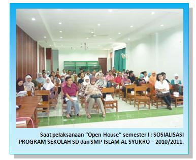 Bertempat di auditorium Gedung Pendidikan Dasar Sembilan Tahun (PDST) Sekolah Islam Al Syukro, Ciputat, Tangerang Selatan, pada Sabtu, 17 Juli 2010, pimpinan SD dan SMP Islam Al Syukro telah melaksanakan salah satu kegiatan rutin di awal semester satu, yakni Open House Semester I: “SOSIALISASI PROGRAM SEKOLAH” untuk Tahun Pembelajaran 2010/2011.