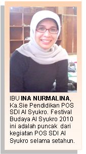 Ditambahkan Ibu Ina, Acara FESTIVAL BUDAYA ini adalah merupakan puncak acara dari seluruh kegiatan POS SDI Al Syukro sepanjang tahun pelajaran 2009-2010. “Seperti kita tahu, kami sudah menyelenggarakan Acara Apresiasi Sastra dan Students Performance Art---yang diantaranya turut melibatkan aktor kawakan nasional yakni Bapak Didi Petet, field trip ke sejumlah lokasi, seperti ke Pusat Kebudayaan India, ke Komunitas Masyarakat Betawi di Setu Babakan, dan belajar langsung tentang dunia teater bersama Bapak Nano Riantiarno dan Ibu Ratna Riantiarno dari kelompok Teater Koma di Taman Ismail Marzuki, Jakarta. Nah, dari keseluruhan acara tersebut, kami gabungkan seluruh ide-idenya untuk kemudian kami gulirkan menjadi FESTIVAL BUDAYA AL SYUKRO 2010 ini,” terang Ibu Ina.