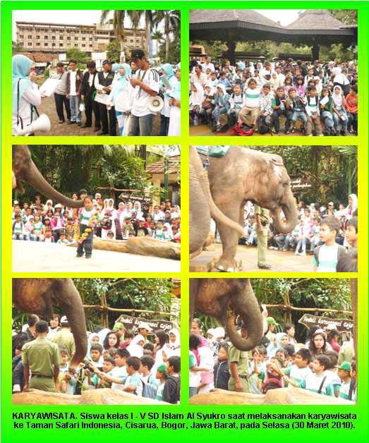 Rombongan siswa kelas I – V SD Islam Al Syukro pada Selasa (30/3/2010) menuju Taman Safari Indonesia (TSI), Cisarua, Bogor, Jawa Barat. Mereka berkunjung ke TSI, Bogor ini dalam rangka melaksanakan karyawisata atau field trip. ”Sengaja kami pilih Taman Safari, agar para siswa dapat mengeksplorasi tentang ciri khas satwa, penggolongan satwa dan lainnya. Ini adalah pembelajaran langsung di lapangan, yang tentu saja sesuai dengan tema pembelajaran yang sudah disampaikan, terutama terkait dengan bidang studi IPA atau Sains. Yang jelas, selain refreshing, para siswa juga tetap harus mengerjakan tugas pada buku Lembar Kerja masing-masing,” tutur Bapak Yayat Nurhidayat S.Si selaku Wakil Kepala SD Islam Al Syukro bidang Kesiswaan.