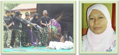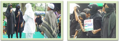 Saat pementasan drama DUKA PALESTINA. ![]() KIRI : Saat adegan dimana UMMU KHUMAIRA ditembak mati oleh tentara zionis Israel. KANAN : Ibu Fatrikhah selaku Koordinator dan penulis naskah drama DUKA PALESTINA. |