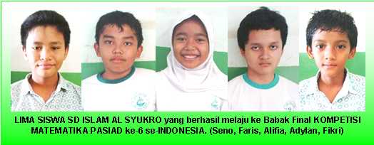Menurut Ibu Tarni SPd selaku Wakil Kepala SD Islam Al Syukro bidang Kurikulum, ada lima siswa SD Islam Al Syukro yang lolos ke babak final. Mereka adalah Seno Wahyu Santoso (kelas VI A), Faris Yudza Ghafari (VI B), Maya Alifia Putri (VI B), Adylan Roaffa Ilmi (VI B) dan Hidayatul Fikri (V B).