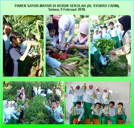 Panen tiba. Banyak hasil bumi dari praktik pembelajaran bercocok tanam (berkebun) di SD Islam Al Syukro dinikmati bersama. Ada jagung dengan kualitas bagus, kangkung yang segar, bayam yang fresh, dan kacang panjang yang ’gemuk’. Aktivitas memanen para siswa SD Islam Al Syukro ini dilaksanakan pada Selasa pagi, 9 Februari 2010 di Kebun Sekolah (Al Syukro Farm).