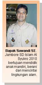 “Kepramukaan atau Kepanduan adalah ekskul wajib. Jadi, dalam kegiatan Jambore SDI Al Syukro 2010 ini, seluruh siswa-siswi kami ikut serta, kecuali para sis wa kelas VI yang sengaja tidak kami libatkan, karena mereka harus mempersiapkan diri untuk menghadapi Ujian Akhir Sekolah Berstandar Nasional (UASBN) pada tanggal 4 hingga 6 Mei 2010,” jelasnya.