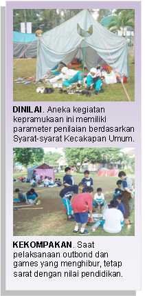 Kami menyelenggarakan outbond sederhana, dan melakukan sejumlah permainan (games) yang menghibur namun tetap berlandaskan pada kekompakan, ketangkasan, keberanian, ketekunan, kecerdasan dan lainnya. Seluruh acara ini memiliki scoring atau penilaian tersendiri, karena memang setiap anggota Pramuka memegang buku SKU atau Syarat-syarat Kecakapan Umum yang harus diisi berdasarkan aneka kegiatan yang ada. Nantinya, para siswa juga akan memperoleh sertifikat kenaikan jenjang kepanduan. (fdl)