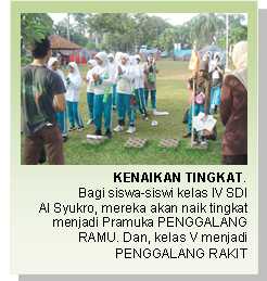 Adapun untuk siswa Pramuka kelas IV, lanjutnya lagi, akan naik tingkat menjadi PENGGALANG Ramu. Sedangkan kelas V akan naik tingkat menjadi PENGGALANG Rakit.