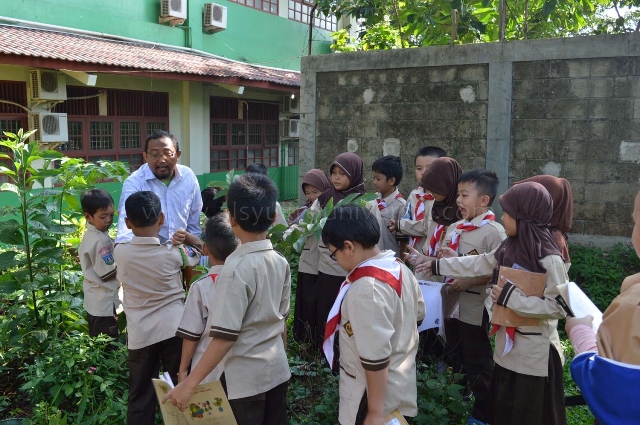 Bapak Djaenuddin, S.Pd., Guru Kelas 2 C SD Islam Al Syukro Universal, mengajak para siswa ke luar kelas menuju Kebun Apotik Hidup yang ada di samping gedung sekolah, Kamis (7/1/2016). Di Kebun Apotik Hidup, Pak Jen mengenalkan satu per satu nama-nama tanaman itu beserta kasiatnya.