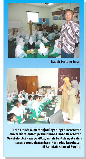 “Nantinya, mereka---para Dokcil ini---akan menjadi agen-agen kesehatan dan terlibat dalam pelaksanaan Usaha Kesehatan Sekolah (UKS). Insya Allah, inilah bentuk nyata dari sarana pendekatan kami terhadap kesehatan di Sekolah Islam Al Syukro,” tuturnya.