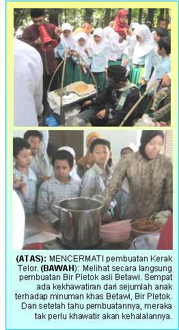 ”Para siswa menelisik lebih jauh mengenai proses pembuatan makanan dan minuman yang khas Betawi, seperti Kerak Telor, dan Bir Pletok yang dijamin halal karena dibuat dari rempah-rempah yang justru penuh khasiat,” tutur Ibu Ika, panggilan akrab Diah Perdana Kartikasari.