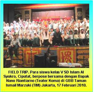 Nah, di saat sibuk mempersiapkan pementasan Sie Jin Kwie inilah, para siswa kelas V SD Islam Al Syukro, dengan dibimbing para guru dan partisipasi aktif Persatuan Orangtua Siswa (POS) SD Islam Al Syukro, berhasil mengadakan pertemuan dengan dua pimpinan Teater Koma yang kondang itu. Inilah sebuah bentuk field trip yang oleh POS SD Islam Al Syukro memang dilandaskan pada acuan Seni dan Sastra. ”Sungguh surprise, kami bisa memperoleh nilai lebih (added value) dari program field trip yang sengaja kami tujukan untuk bertemu dengan Teater Koma di TIM ini,” kata Ibu Diah Perdana Kartikasari, Ketua POS SD Islam Al Syukro.