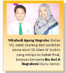 “Pada Kompetisi PASIAD ke-7 yang dilaksanakan bulan Desember kemarin, ada sebanyak sembilan anak-anak didik SD kita yang berhasil melaju ke babak final. Adapun pelaksanaan babak finalnya akan dilaksanakan pada Sabtu, 19 Februari 2011,” ujar Ibu Asri A Nugraheni selaku Guru Sains SD Islam Al Syukro yang aktif mendampingi para siswa berkompetisi.