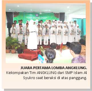 Sekolah Islam Al Syukro kembali menunjukkan kemampuan terbaiknya dalam berkreasi. Tak hanya untuk menyelenggarakan sebuah pergelaran kompetisi, tapi juga sekaligus meraih prestasi pada lomba demi lomba yang diikuti. Acara tersebut adalah ‘FESTIVAL SENI DAN BUDAYA’, yang merupakan sebuah ajang kerjasama antara Pengurus Gugus 03 Kota Tangerang Selatan (Tangsel) dengan SMP Islam Al Syukro. Acara ini dimaksudkan guna lebih mengembangkan bakat dan kreatifitas seni para pelajar (khususnya tingkat SMP) se-Gugus 03 Kota Tangsel. Acara yang dilaksanakan pada Sabtu (12/2) di hall Sekolah Islam Al Syukro, Ciputat, ini dibuka secara resmi oleh Kepala Dinas Pendidikan Kota Tangsel Bapak Drs Mathoda S, M.Si, dan diikuti oleh sekitar 600 pelajar dari 20 SMP yang ada di wilayah se-Gugus 03 Kota Tangsel.