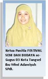 Dalam sambutannya, Ketua Panitia ‘FESTIVAL SENI DAN BUDAYA’, Ibu Wiwi Adawiyah SPdI---yang merupakan salah seorang guru di SMP Islam Al Syukro---mengatakan, acara festival yang memilih tema MERAJUT KEINDAHAN NUSANTARA MELALUI SENI ini bertujuan untuk menjadi jembatan bagi para siswa-siswi sekalian, khususnya dalam rangka mengembangkan minat dan bakatnya pada bidang kesenian maupun kebudayaan nasional. “Yang jelas, kami selaku panitia mengucapkan selamat bertanding dan kami berharap agar para peserta selalu memberikan penampilan yang terbaik, serta tetap menjunjung tinggi sportifitas yang tinggi,” ujar Ibu Wiwi yang baru-baru ini terpilih sebagai salah seorang dari empat guru/karyawan berprestasi di lingkungan Sekolah Islam Al Syukro sepanjang 2010 kemarin.
