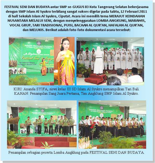 FESTIVAL SENI DAN BUDAYA se-GUGUS 03 Kota Tangsel di SMP Islam AlSyukro (4) Perguruan Islam Al Syukro Universal Berita SMP 22 February 2011 Hits: 2828