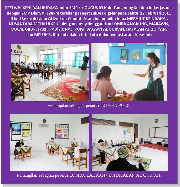 FESTIVAL SENI DAN BUDAYA se-GUGUS 03 Kota Tangsel di SMP Islam AlSyukro (7) Perguruan Islam Al Syukro Universal Berita SMP 22 February 2011 Hits: 2614