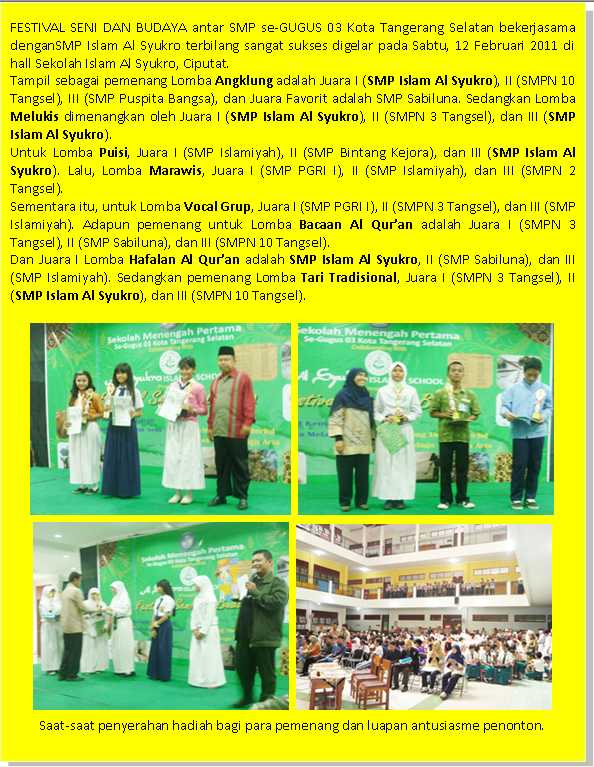 FESTIVAL SENI DAN BUDAYA se-GUGUS 03 Kota Tangsel di SMP Islam AlSyukro (8) Perguruan Islam Al Syukro Universal Berita SMP 22 February 2011 Hits: 3496