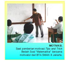 Misalnya, kata Ibu Peni, memotivasi siswa untuk latihan ”membongkar” soal-soal yang sulit dan menemukan jawaban yang termudah. Bedah Soal ini dilakukan, dengan menghadirkan dua motivator dari BTA SMAN 8 Jakarta.