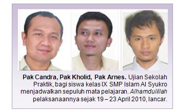 Baru saja usai menuntaskan jadwal Ujian Sekolah Tulis Utama, pada 12 – 15 April 2010, para siswa kelas IX SMP Islam Al Syukro kembari harus menghadapi Ujian Sekolah Praktik yang diselenggarakan sejak Senin (19 April 2010) hingga Jum’at ( 23 April 2010).