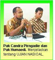 Tak ketinggalan, dijelaskan pula mengenai prediksi pengumuman hasil kelulusan Ujian Nasional. Menurut Pak Candra yang juga Guru Bahasa Inggris ini, untuk UJIAN NASIONAL UTAMA, pengumuman hasil kelulusan peserta didik dari satuan pendidikan oleh masing-masing satuan pendidikan akan dilaksanakan paling lambat pada: 7 Mei 2010.