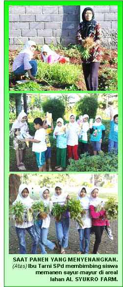 Selasa pagi, 9 Februari 2010. Mentari baru saja sepenggalahan. Sinarnya masih terasa hangat. Tapi, aktivitas di areal lahan Kebun Sekolah milik SD Islam Al Syukro sudah sangat ramai. Riuh-rendah suara para siswa SD Islam Al Syukro, sambil kedua-tangannya sigap bekerja. Dengan riang gembira, bersama para guru pendamping dan pembimbing, mereka asyik memetik jagung, kacang panjang, kangkung dan bayam. Benar, mereka sedang memanen hasil bumi, hasil tanam dan hasil perawatan tanaman milik para siswa sendiri di Al Syukro Farm.