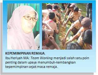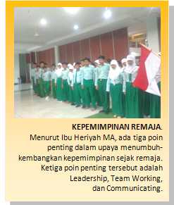 Menurut Ibu Heriyah, ada tiga poin penting dalam upaya menumbuh-kembangkan kepemimpinan sejak remaja. “Ketiganya adalah LEADERSHIP, TEAM WORKING, dan COMMUNICATION. Untuk Leadership, yang perlu dikembangkan adalah self leadership, atau kepemimpinan bagi diri sendiri melalui aktivitas sehari-hari; Pemberian tanggung jawab pada hal-hal yang dikerjakan, sehingga itu dapat melatih jiwa kepemimpinannya; dan Dukungan kepercayaan bahwa remaja telah mampu melakukan tugas-tugas keseharian,” tuturnya.