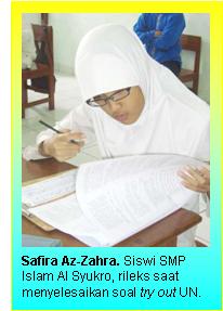Sementara itu, menilik paket soal try out Bahasa Indonesia, Bapak Dian Tri Mulyawan S.Pd.I, guru bidang studi Bahasa Indonesia SMP Islam Al Syukro mengatakan, secara keseluruhan soal sudah sesuai dengan SKL (Standar Kompetensi Lulusan), dan kisi-kisi yang digariskan oleh Departemen Pendidikan Nasional RI.