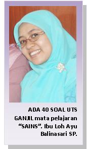 Ibu Sari (sapaan akrab Ibu Loh Ayu Balinasari) menjelaskan hal tersebut, ketika ditanya mengenai cakupan materi Ujian Tengah Semester (UTS) Ganjil mata pelajaran ‘Sains’ di SMP Islam Al Syukro, yang diselenggarakan pada 11 – 18 Oktober 2010.