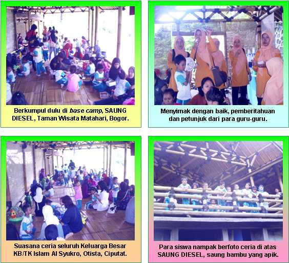 Begitu tiba di TWM, rombongan KB/TK Islam Al Syukro langsung menempati base camp yaitu Saung Diesel, sebuah saung bambu bertingkat yang mampu menampung hingga 80 orang pengunjung. Selebihnya, para siswa menikmati wahana permainan yang ada, semisal Sepeda Air, Peddle Boat, Perahu Dayung, Perahu Boat, Bamper Boat, Mobil Safari dan Renang. Kalau pun ada anjungan mobil-mobilan mini yang disebut All Terrain Vehicle (ATV), Outbond, Flying Fox, Arung Jeram, Wahana Persawahan dan lainnya, maka para orangtua siswa dipersilakan memilih sendiri paket wisata tersebut.
