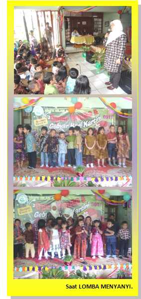 Selama dua hari berturut-turut (Kamis-Jum’at, 21-22 April 2011), TK Islam Al Syukro – Otista menggelar acara OPEN HOUSE & GEBYAR HARI KARTINI 2011 di lobby sekolah. Aneka lomba dipertandingkan dalam acara tersebut. Berikut ini, adalah daftar pemenang LOMBA MENYANYI.