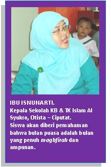 Selama bulan Agustus---yang bertepatan juga dengan bulan suci Ramadhan 1431 Hijriah---ini, Kelompok Bermain dan Taman Kanak-Kanak (KB & TK) Islam Al Syukro, Otista – Ciputat, menetapkan acuan tema pembelajarannya yaitu ‘AKU IKHLAS BERPUASA KARENA ALLAH SWT’.