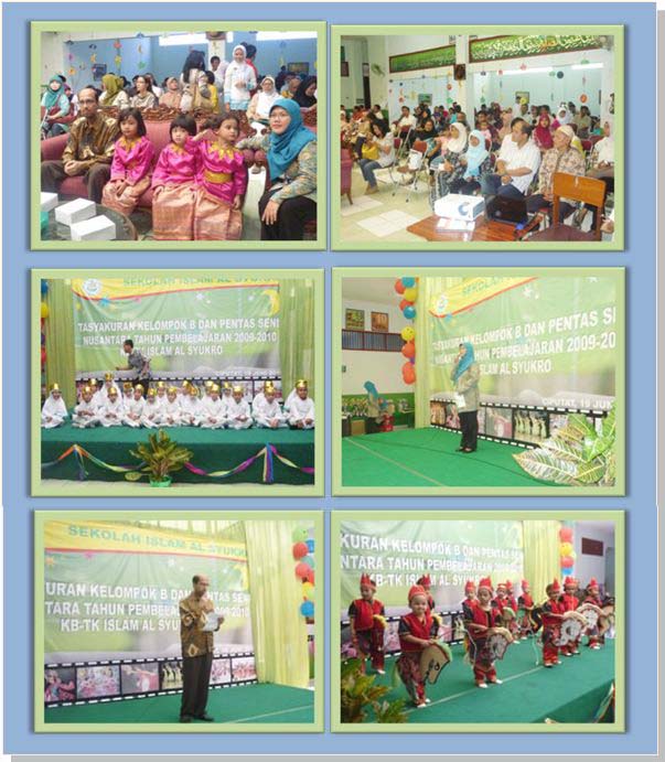 Pada Sabtu, 19 Juni 2010, TK Islam Al Syukro, Ciputat menyelenggarakan acara Tasyakuran Kelompok B dan Pentas Seni Nusantara Tahun Pembelajaran 2009-2010 di auditorium TK Islam Al Syukro, Ciputat, Tangerang Selatan, Banten. Sejumlah mata acara dipentaskan dalam acara yang meriah dan penuh syukur ini, diantaranya: Pembacaan Asmaul Husna oleh para siswa Kelompok B, Tari Ampar-Ampar Pisang, Tari Kampung Nan Jauh Di Mato, Tari Jaranan, Tari Bungo Jeumpa, Pengukuhan dan Penyerahan Sertifikat Kelulusan dan lainnya. Berikut, dokumentasi foto pada kegiatan tersebut: